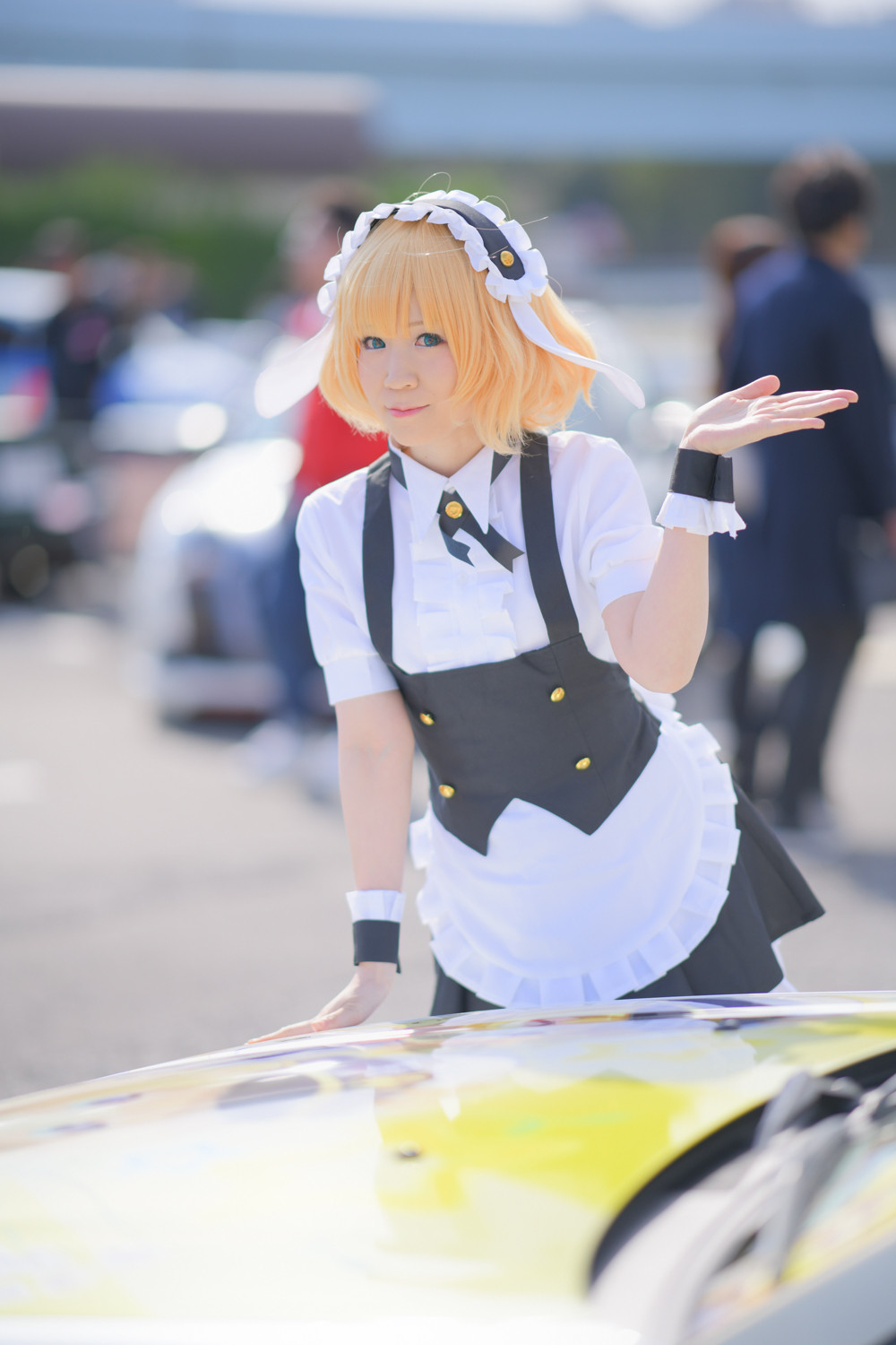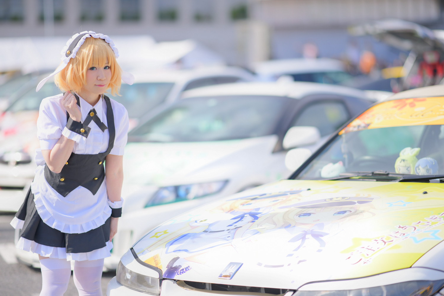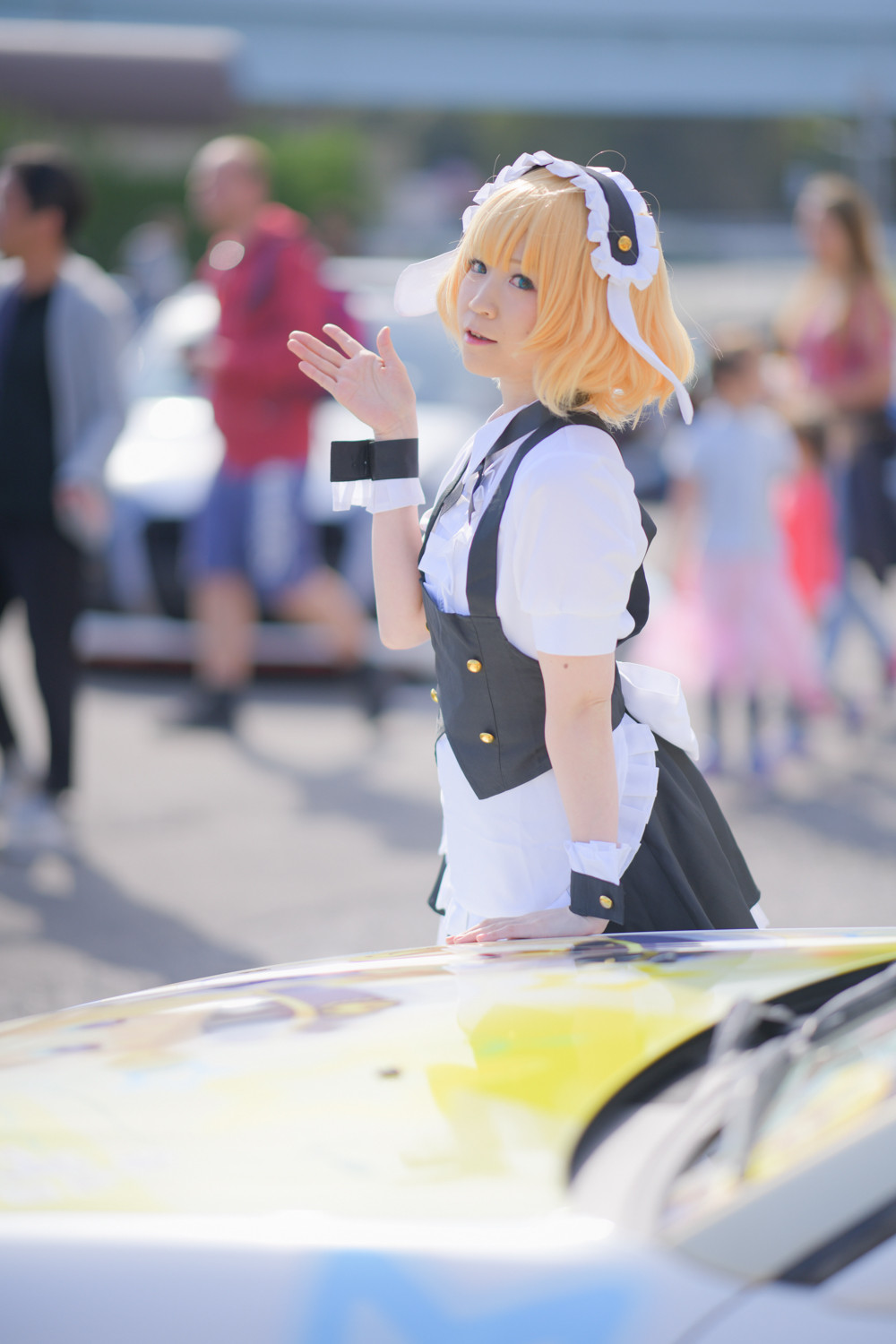 ちなみに余談ですが、ほかのコスプレイベントと大きく違う点として、痛車をバックに撮影することが多く、ほぼ囲み撮影であること。またこういうイベントの場合、被写体と距離が離れられるので、望遠レンズを多様する人が多いこと、スペースにも余裕があるので、ライトスタンドなど大型機材を持ち込んで撮影すること、などができるのが、ほかのイベントではなかなかできない魅力かなと思います。