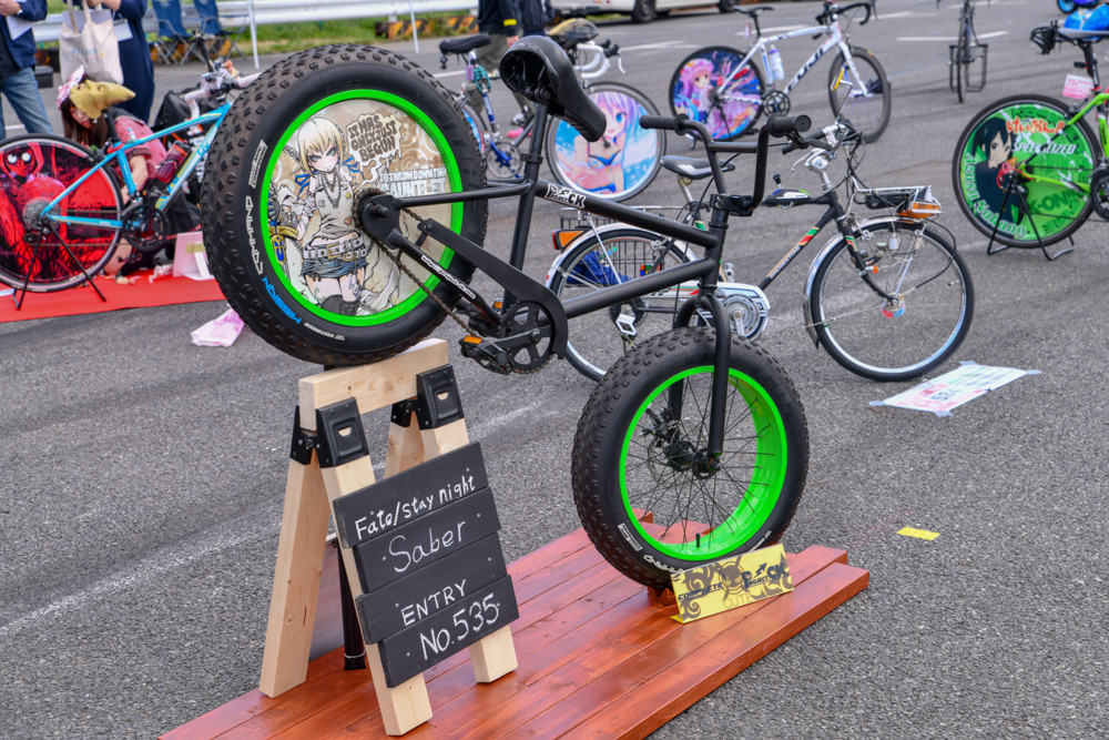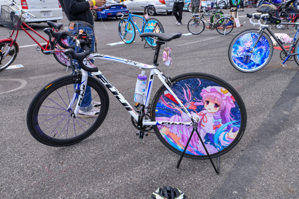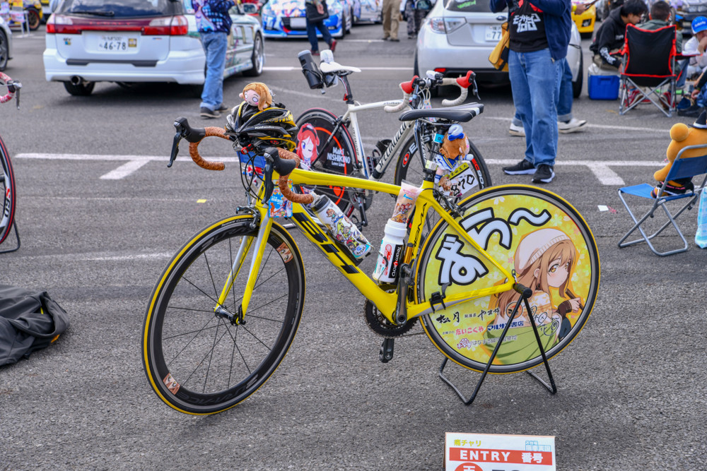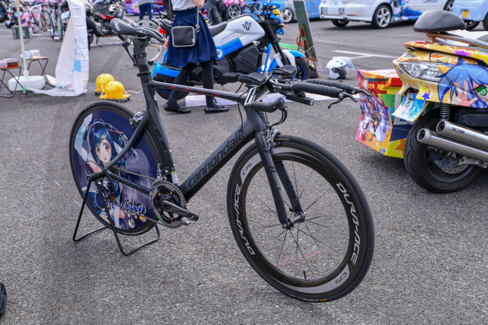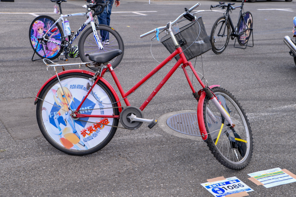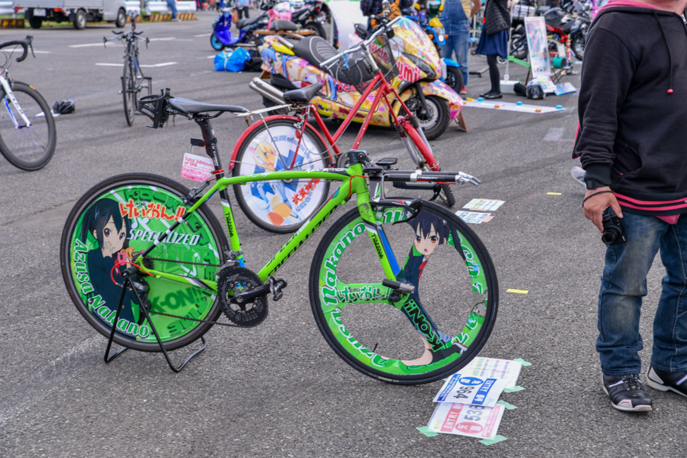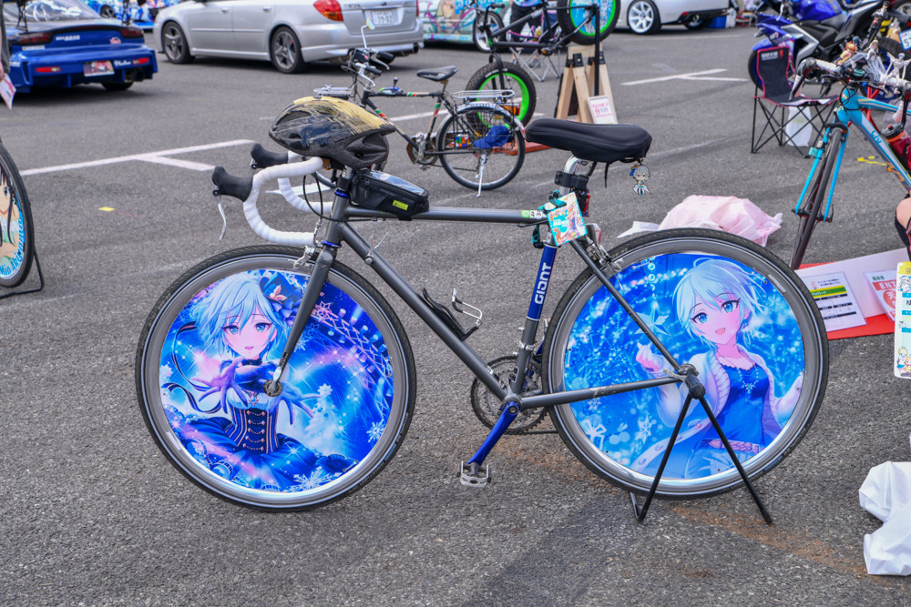 痛車天国では、痛車だけでなくキャラクターでラッピングされた痛バイク…痛単車や、ホイールカバーをキャラクター仕様にした痛チャリなども展示されていました。