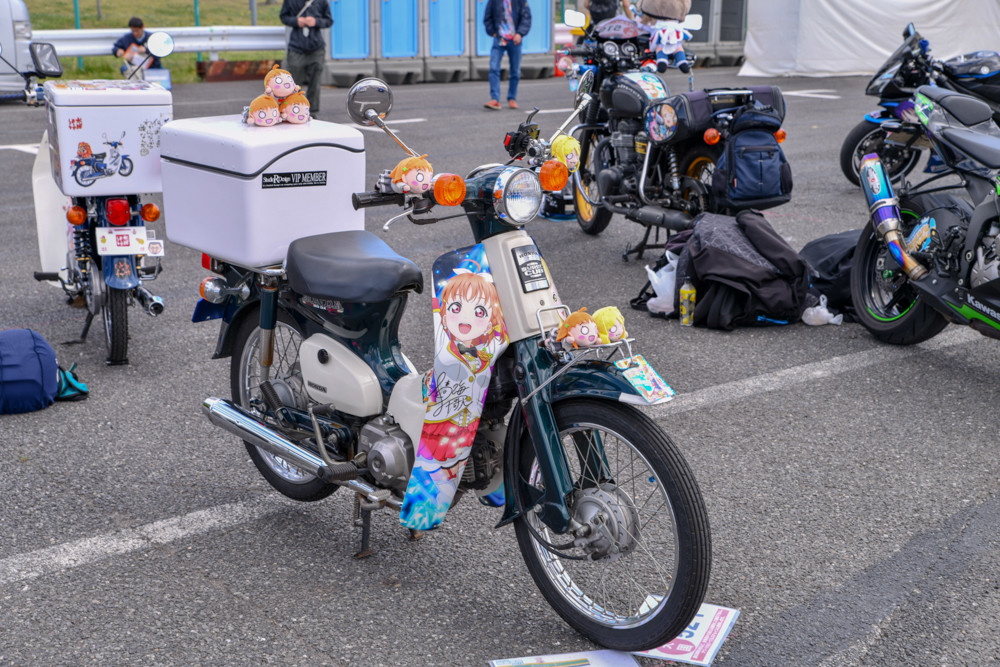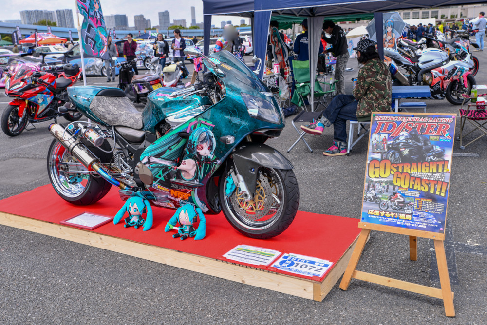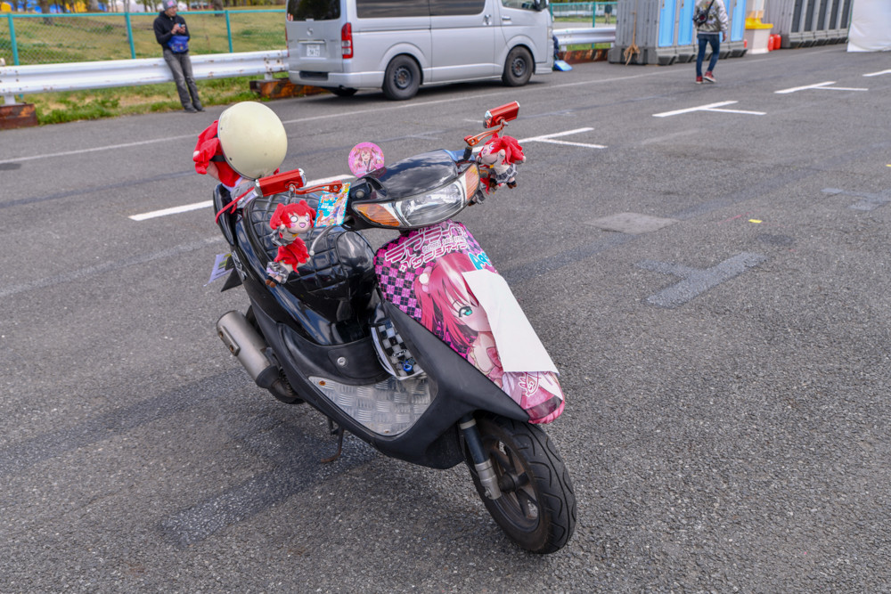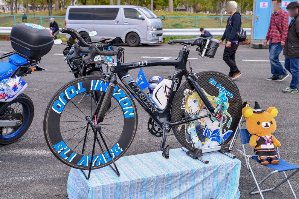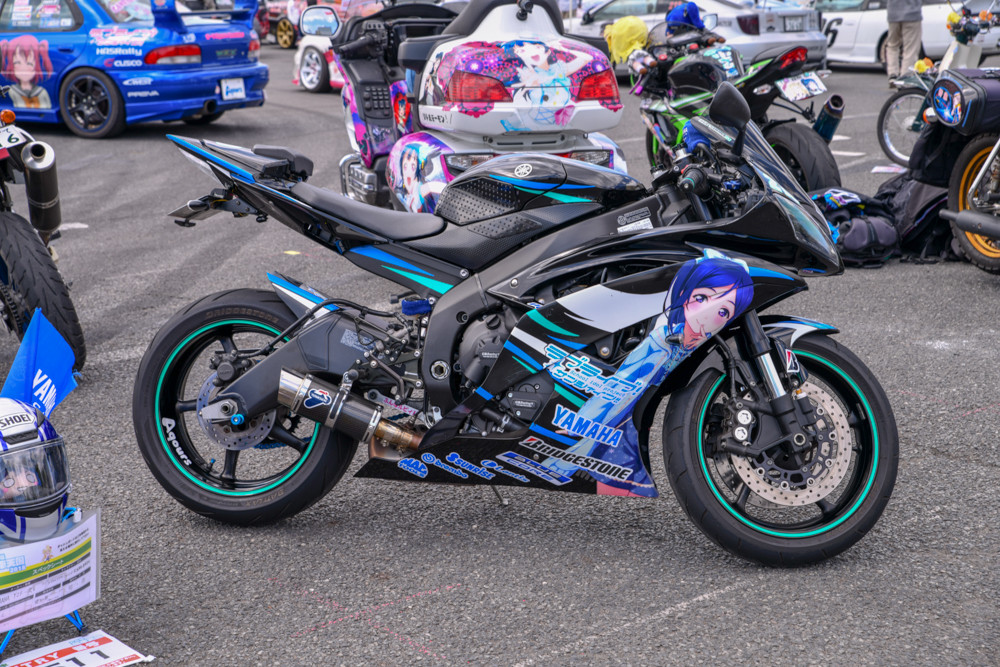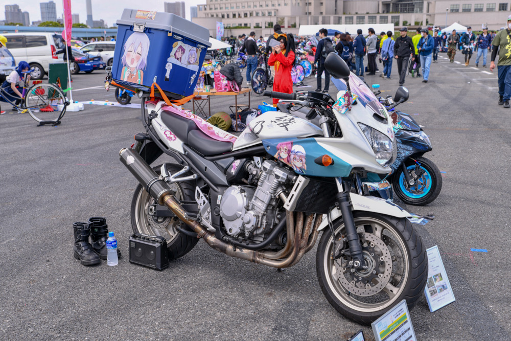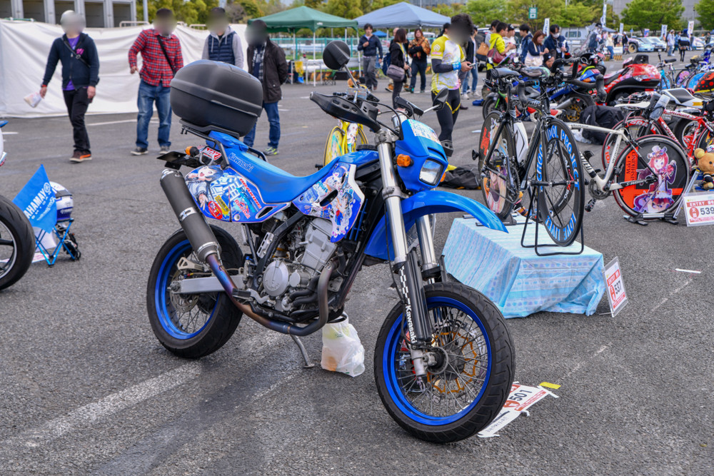 痛車天国では、痛車だけでなくキャラクターでラッピングされた痛バイク…痛単車や、ホイールカバーをキャラクター仕様にした痛チャリなども展示されていました。
