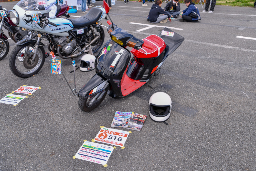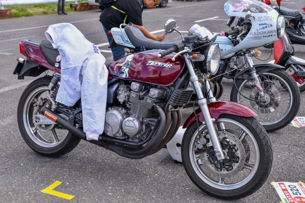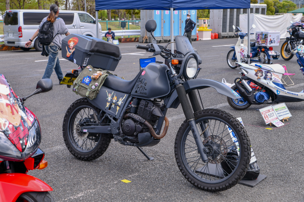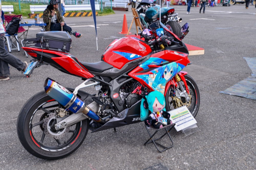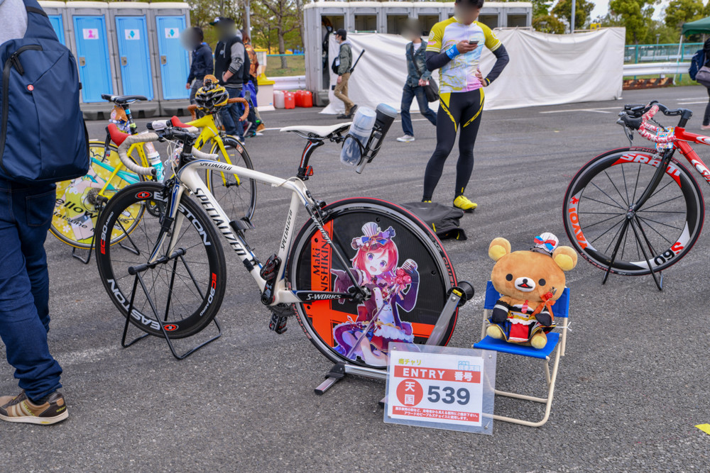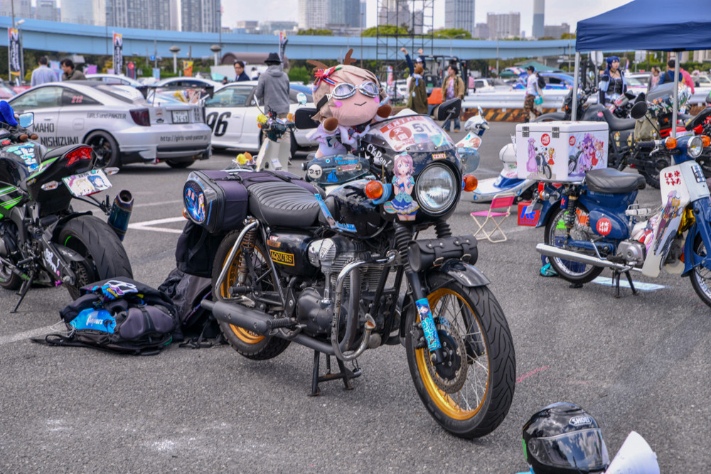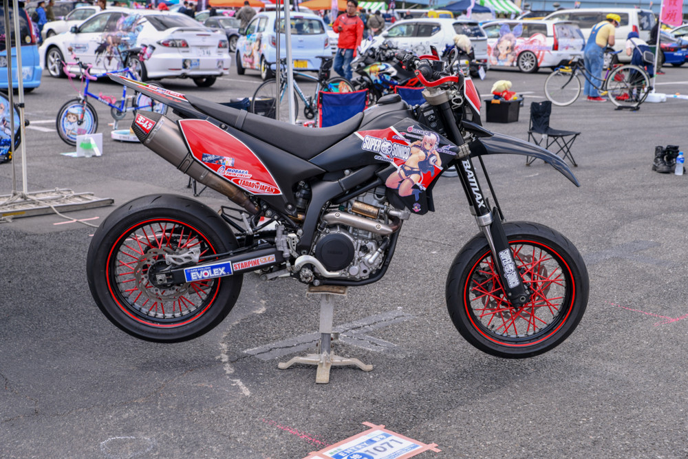 痛車天国では、痛車だけでなくキャラクターでラッピングされた痛バイク…痛単車や、ホイールカバーをキャラクター仕様にした痛チャリなども展示されていました。