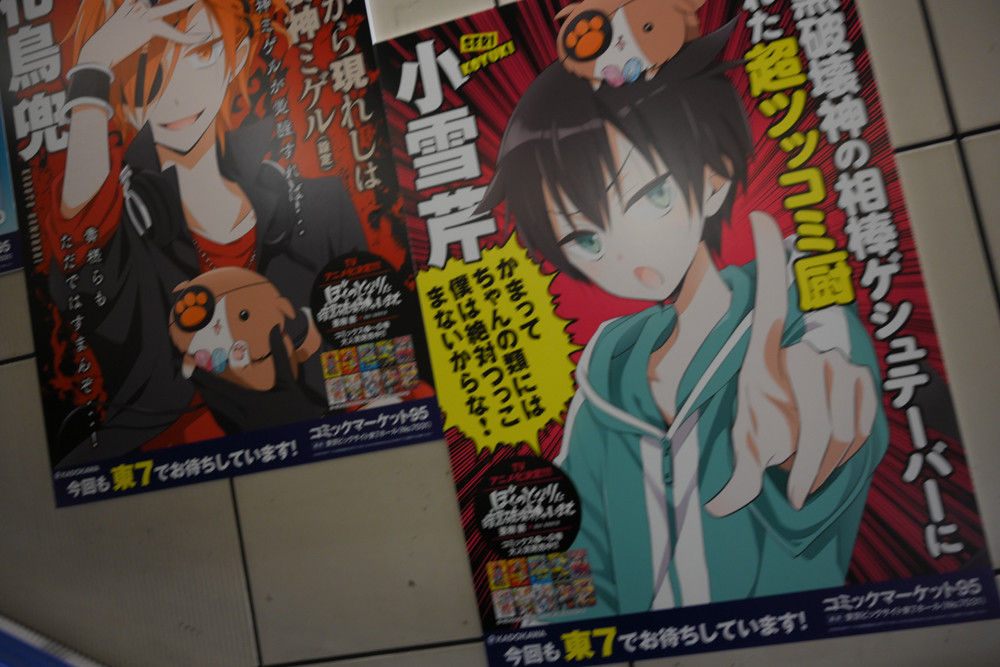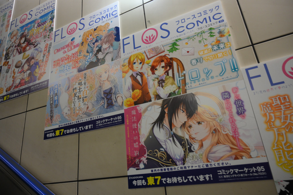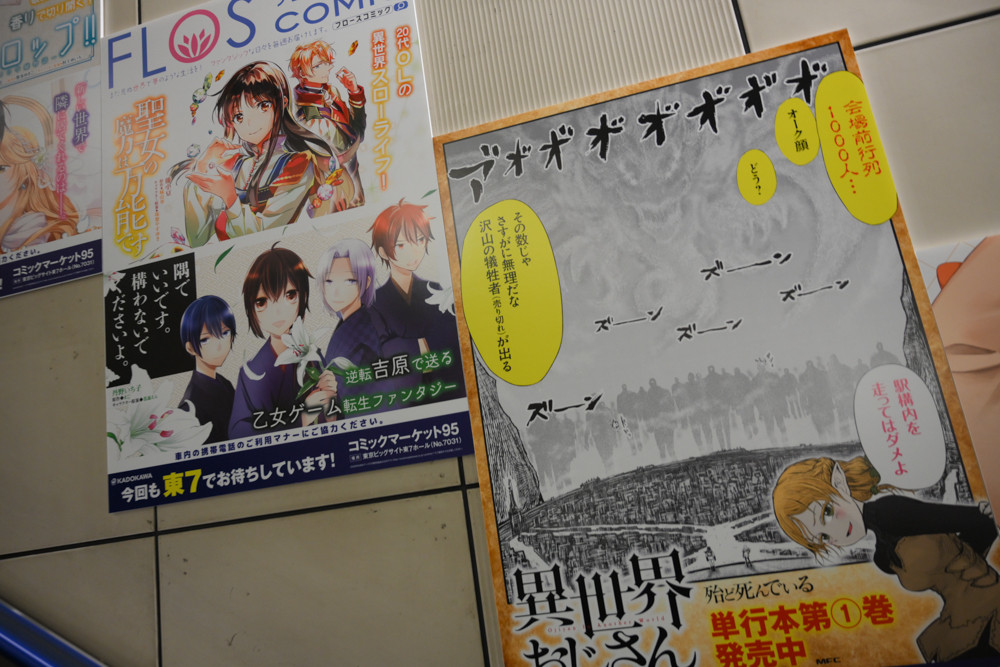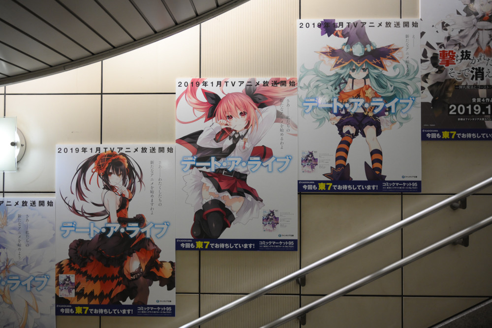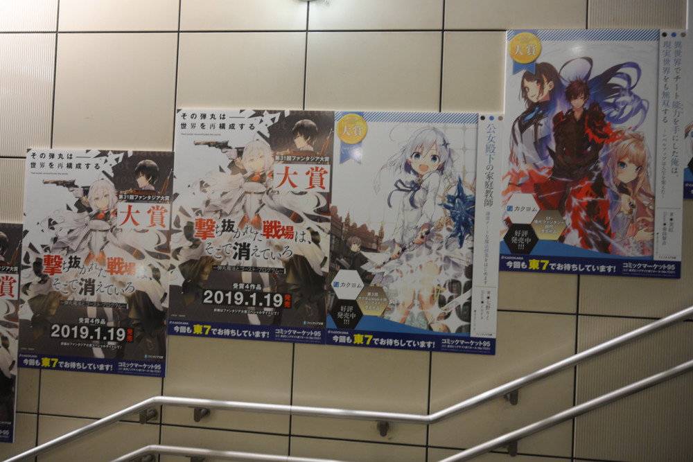 国際展示場駅構内は、毎年恒例たくさんのアニメや漫画、ライトノベルなどの広告が掲出されていました。今回、撮影にやや失敗してブレてる写真の割合が多いと思いますが許してください。