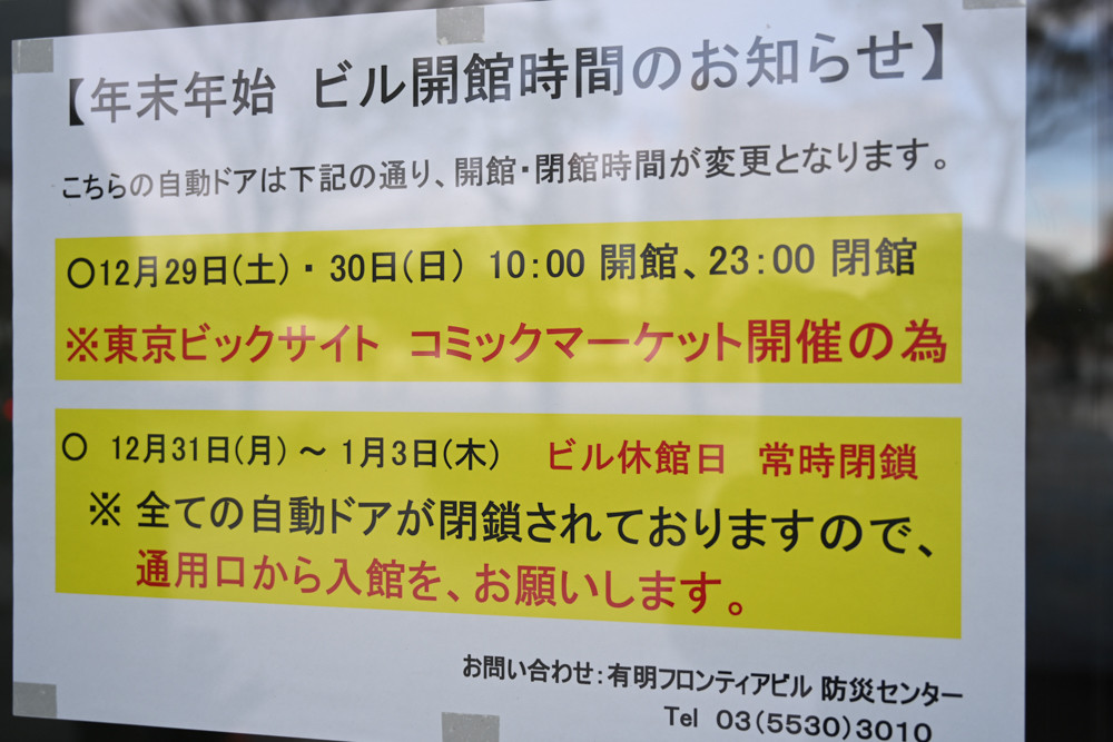 有明フロンティアビル、コミケ期間中29日と30日は10時オープン、31日は休館日。