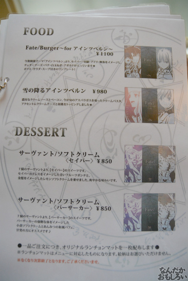 「Fate/Zero~stay night Cafe」メニュー表