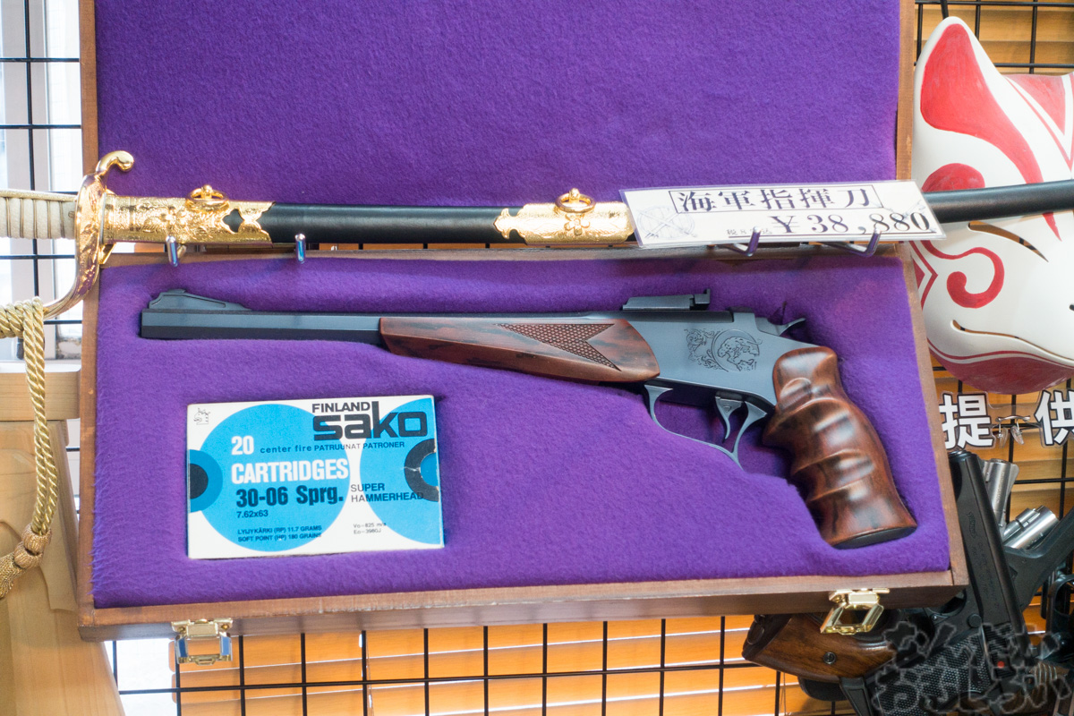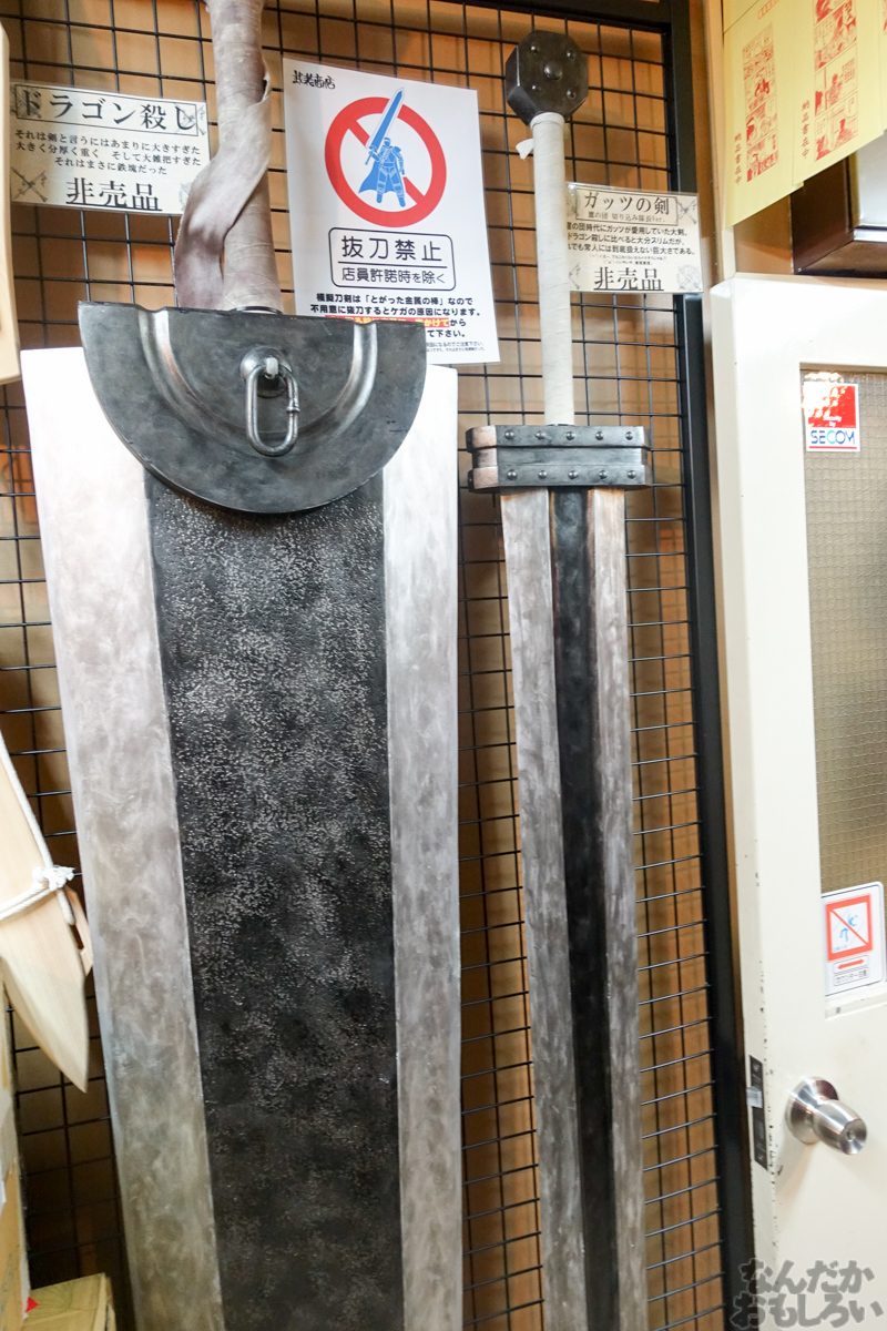 日本の刀剣だけでなく、西洋の刀剣やライフル、トンファー、チェインメイル、ひのきのぼう、ドミネーター、ガッツの剣(非売品)など様々な武器・防具も展示販売されていました。