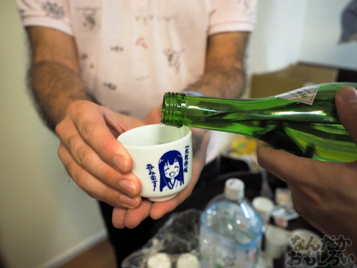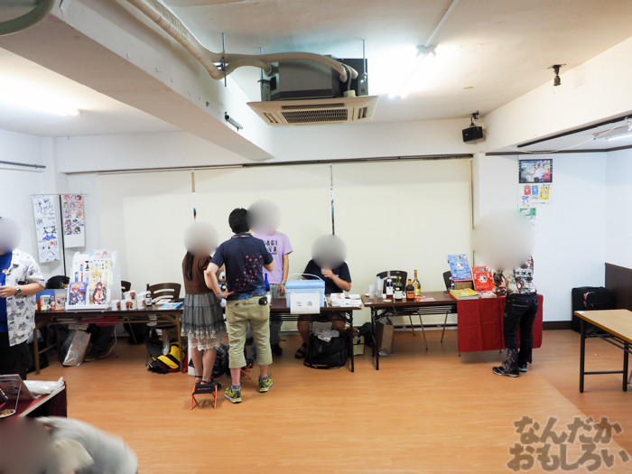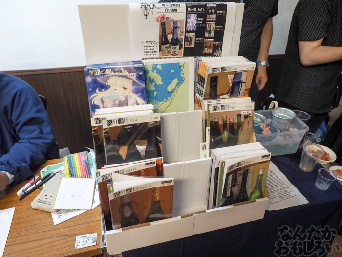 「酒っと」1部は18時にスタート。開始と同時に会場は人でいっぱいになり、移動するのも困難になるほど大盛況。1部ではお酒を振舞うサークルが多かったことや、食事はビアガーデンがメインだったこともあり、同人誌頒布+立ち飲みという雰囲気に。ついつい管理人も雰囲気に負けて飲んでしまい…。