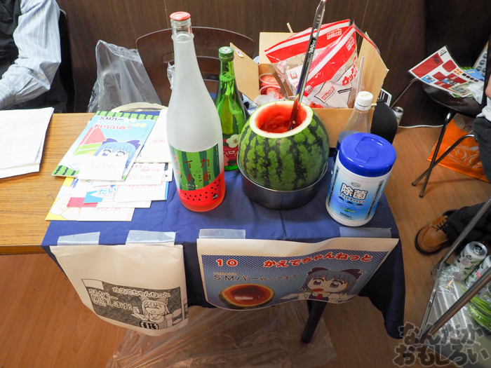 サークル「かえでちゃんねっと」では、スイカに関する本や、スイカのお酒などを振舞っていました。