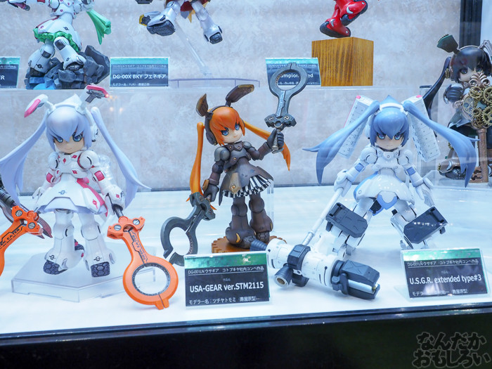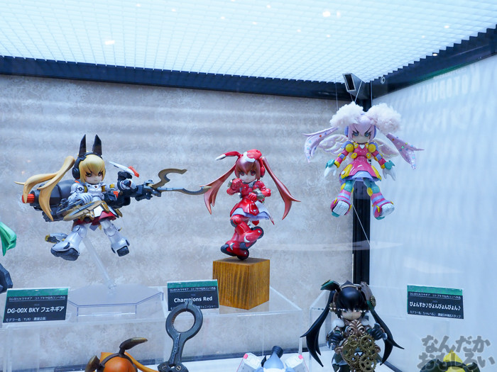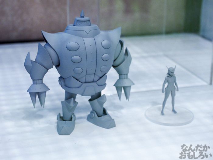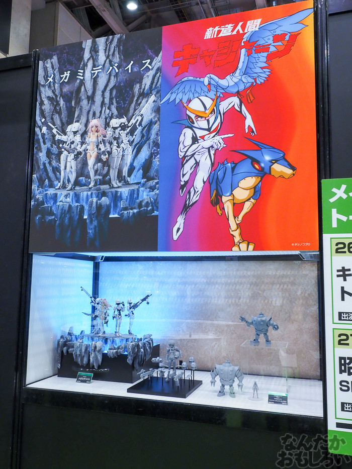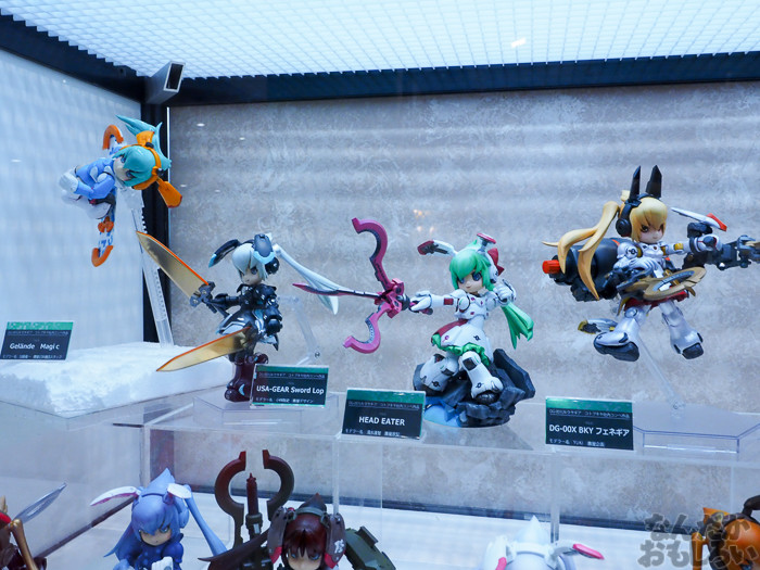 こちらでは、フィギュアメーカー・コトブキヤブースの展示フィギュアをお届け。コトブキヤブースでは、「スパロボ」「キャシャーン」「武装神姫」などの新作プラモデル、「神撃のバハムート」「物語シリーズ」、そしてキューポッシュシリーズ、ほか「DG-001LN ウサギア コトブキヤ社内コンペ作品」「M.S.G モデリングサポートグッズ」などを展示。特に初心者から上級者まで全てのモデラーをサポートすべく開発された「M.S.G モデリングサポートグッズ」には力を入れているとのことで、ヘヴィウェポンが実際に可動する様子などを見ることができました。