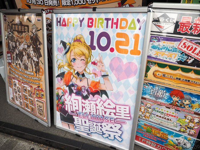 本日10月21日は「ラブライブ!」絢瀬絵里が誕生日を迎え、Twitterなどでは多くのお祝いコメントなどが寄せられました(関連記事)。また秋葉原の各ショップでも、絢瀬絵里の誕生日をお祝いする掲示が今回も行われていました。早速その様子を写真でお届けします。