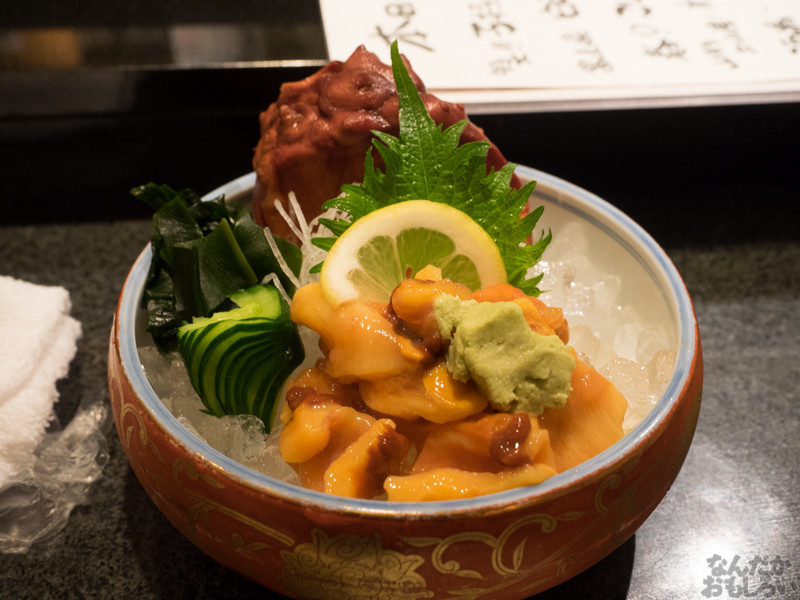 そしてこちらも初挑戦のホヤ。赤いぶつぶつの塊で見た目はちょっと気持ち悪いんですが、特徴的なコリコリ食感が最高にたまりません!