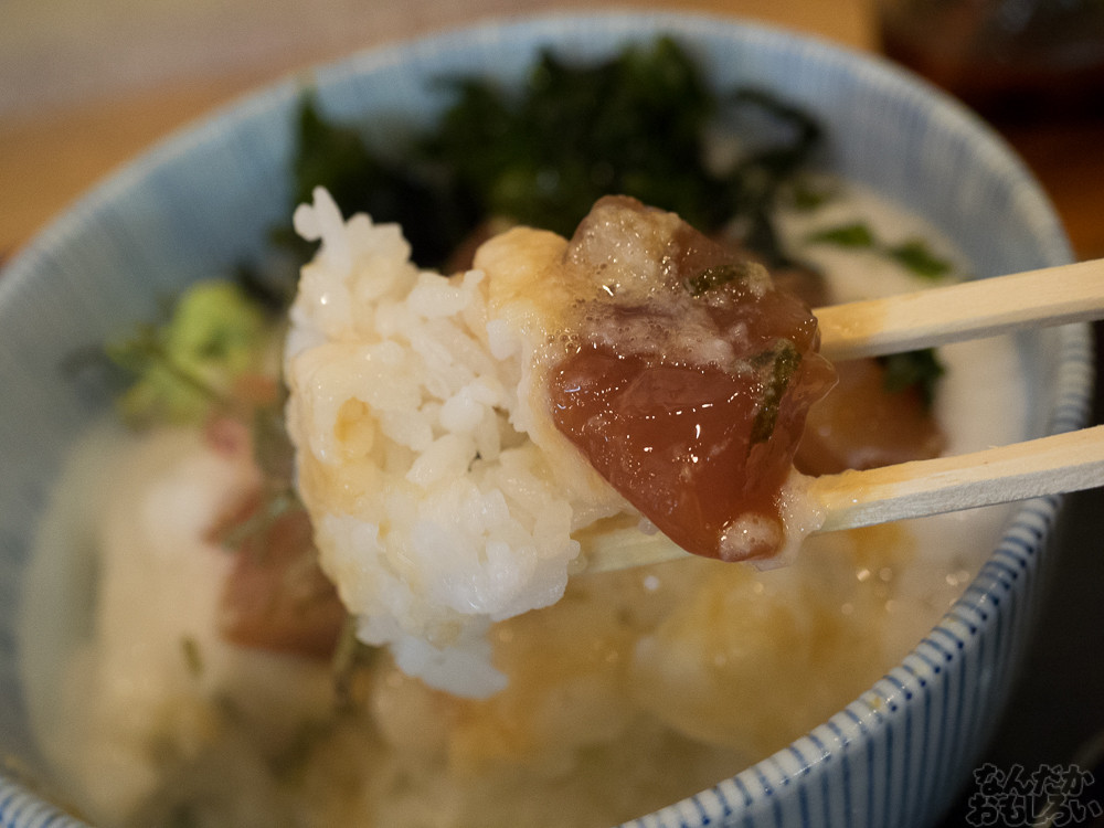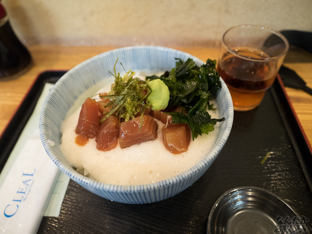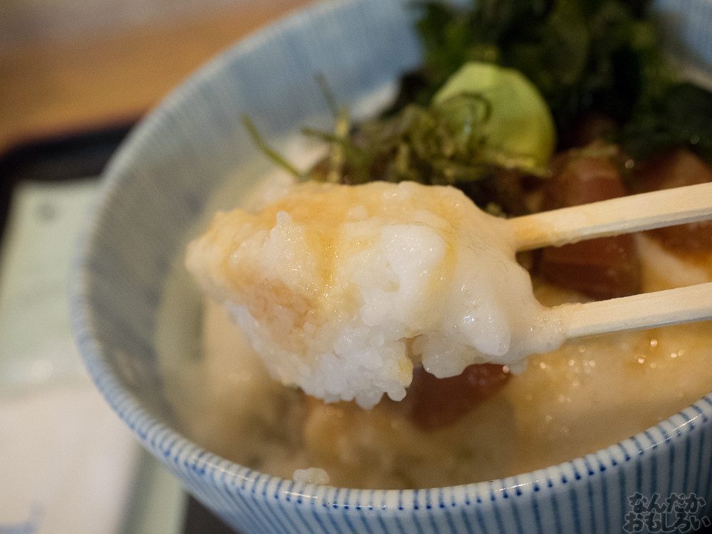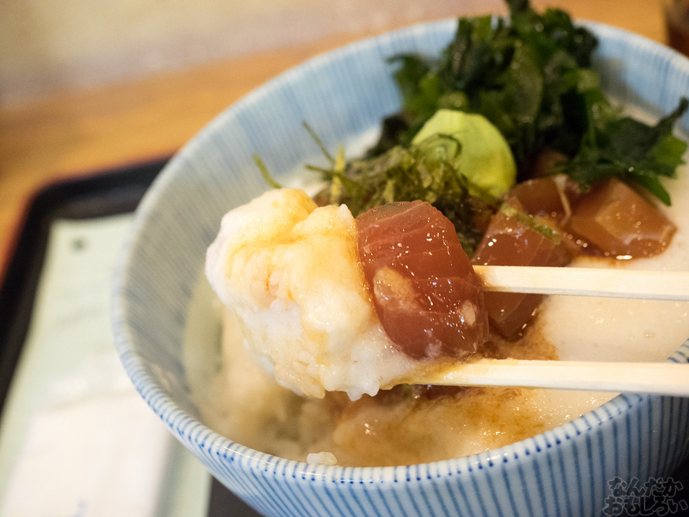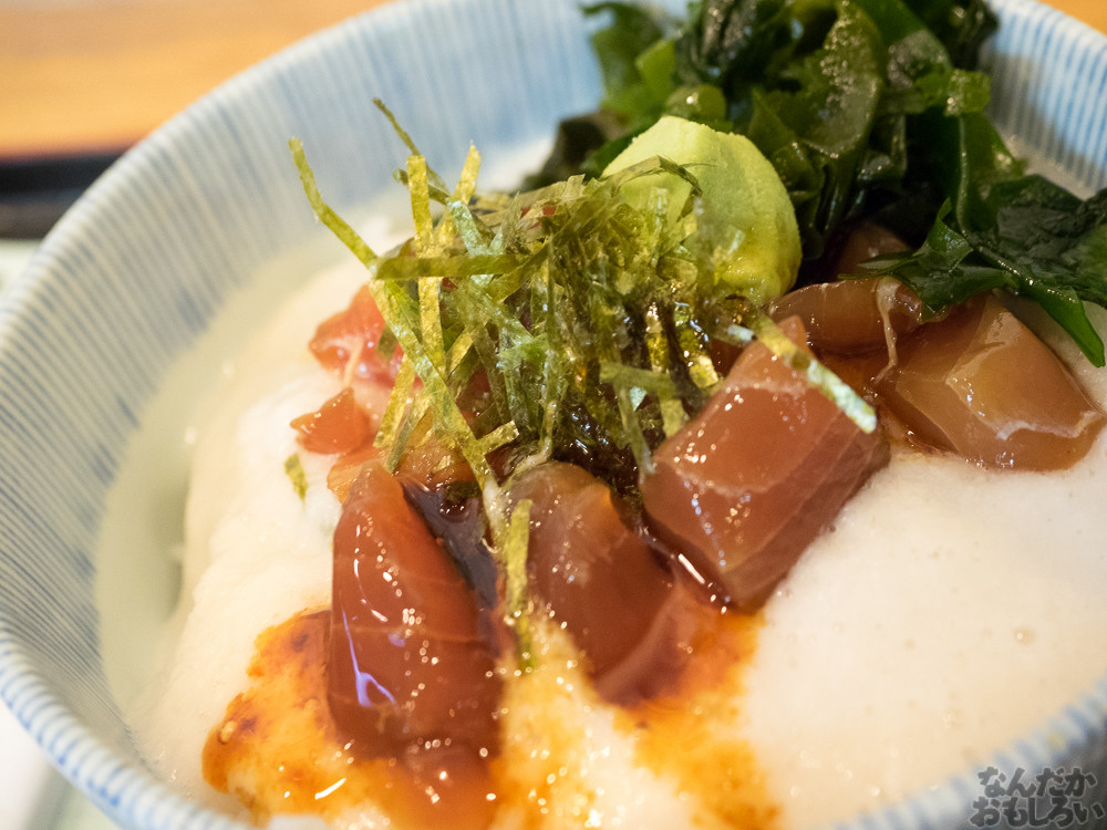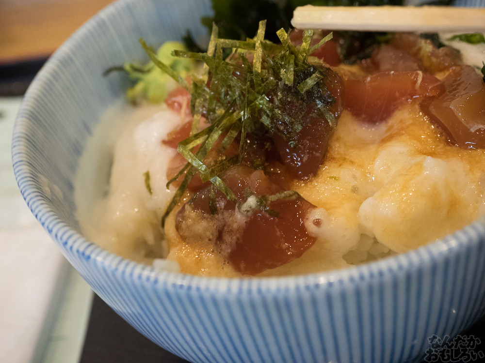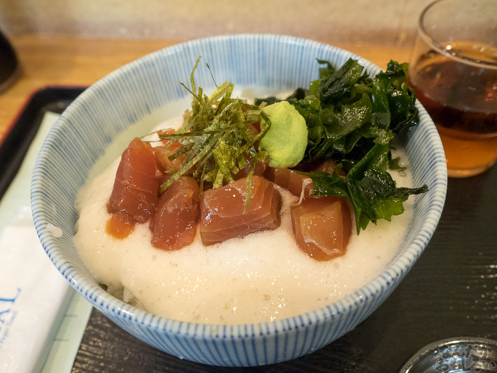 というわけで、まぐろの山かけ丼食べます。これで500円という安さ!真っ白なとろろに、ちょっと味のついたまぐろの赤身。しょうゆをかけて食べましょう。