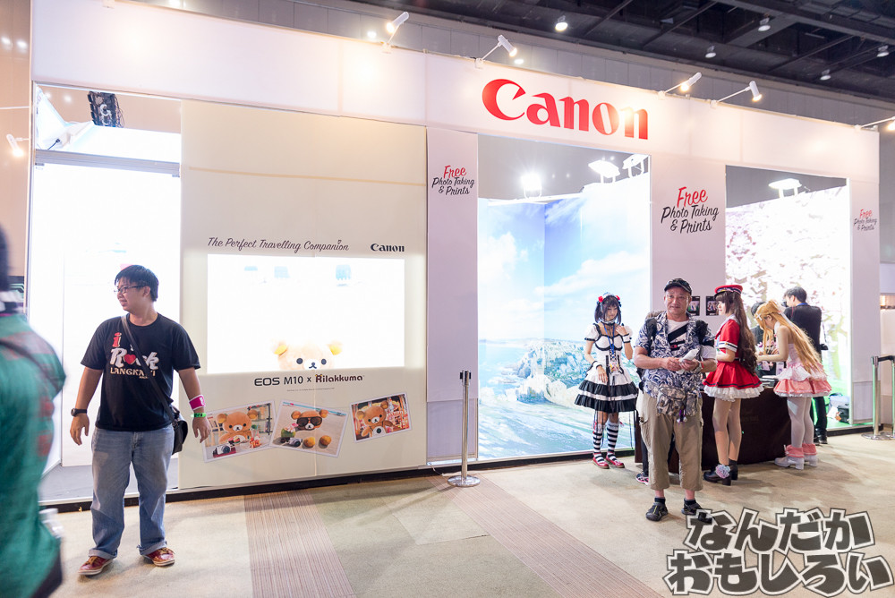 特にコスプレコンパニオンに力を入れていたのが、カメラメーカー・キヤノンのブース。日本ではあまり見ることができないのですが、キヤノンがオタクイベントにブース出展をしていて、簡易撮影スタジオとスタッフによる撮影が自由に行える環境が整っています。またカメラも複数用意されていて、きになったカメラがあれば相談にも乗ってくれるという、コスプレイヤーにはたまらないブースとなっていました。