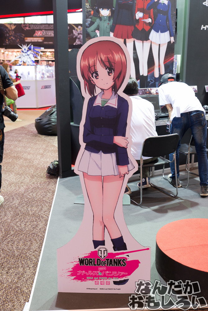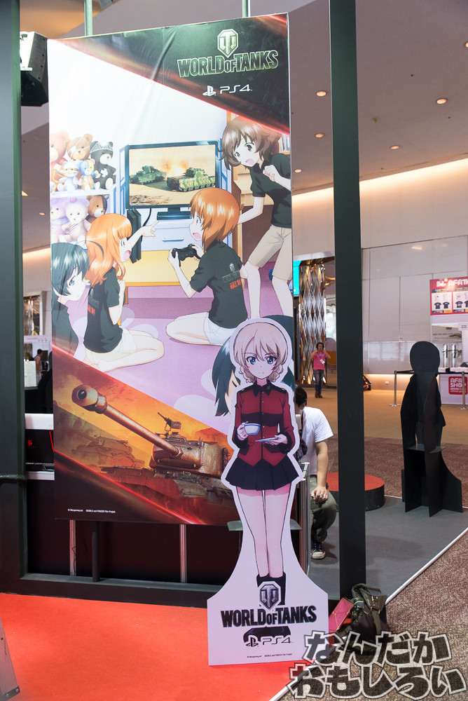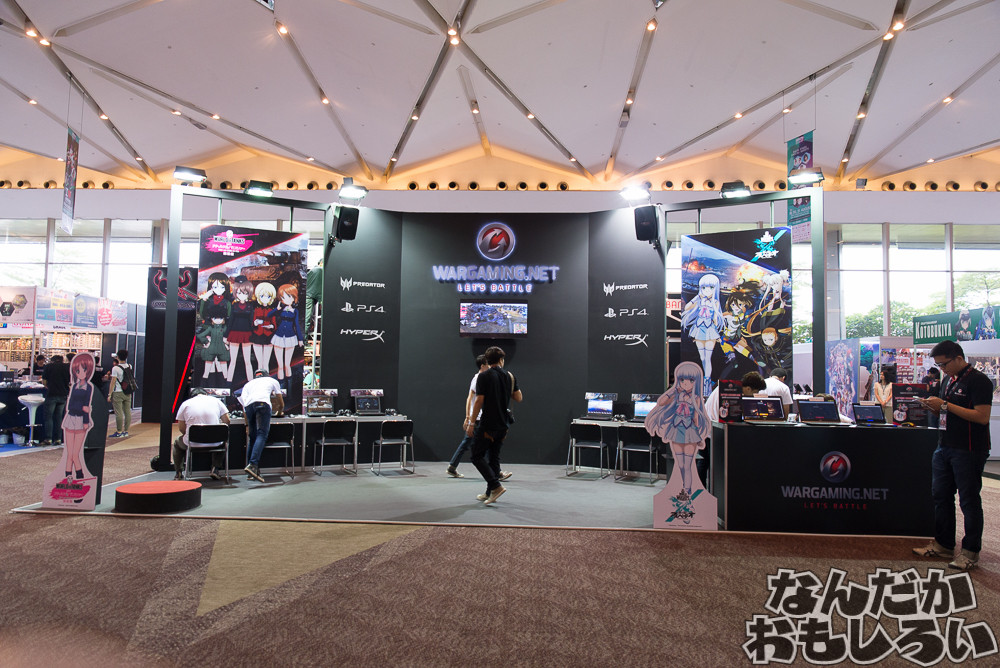 個人的に注目したのが、ウォーゲーミングブース。PlayStationブースやバンダイブース、グッドスマイルカンパニーブースなど、日本でも有名で人気の企業が続々と出展していたのですが、ウォーゲーミングブースでは海外では非常に珍しい「ガールズ&パンツァー」を推した展開をしていました。ガルパンは日本でこそ非常に人気で各イベントでもブースで見かけることはあるのですが、海外(アジア・東南アジア圏)ではブースはおろかコスプレイヤーや同人関連のものも全く見ないことが多いので、これほど展開しているのはかなりレアだと言えます。