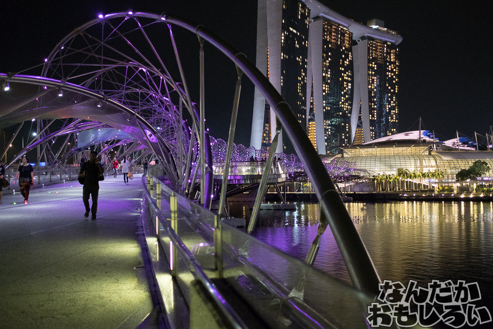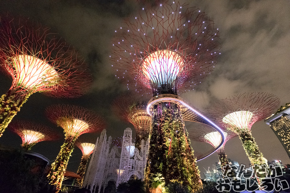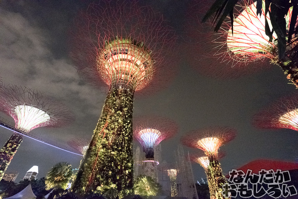 目的地は、植物園かつライトアップが美しいと言われている「ガーデンズ バイ ザ ベイ」。特徴的な巨大人口の木のある、おそらくシンガポールでないと見れないスポットです。そしてそれまでの道のりも、キレイにライトアップされていたのでしゃしんパシャパシャ撮ってきました。名称が分からんけど、おそらく撮影スポットのはず。