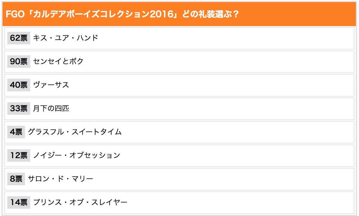 「Fate/Grand Order(FGO)」にて「復刻:カルデアボーイズコレクション2016」が発表されました。こちらで入手できる期間限定概念礼装は8枚あり、交換は1枚だけ。…ということで、半日経たずですがどの概念礼装が欲しいかの人気投票を行いました。その結果を発表します。