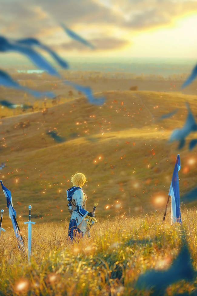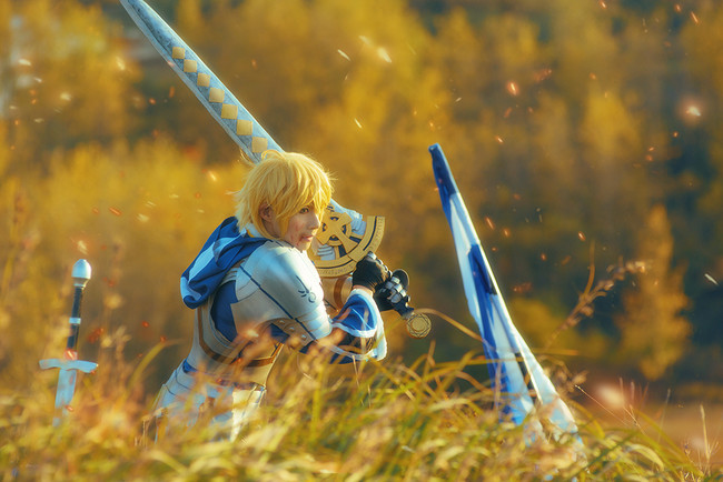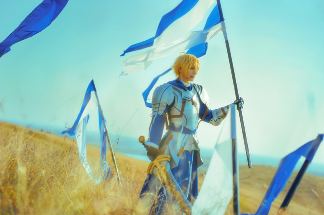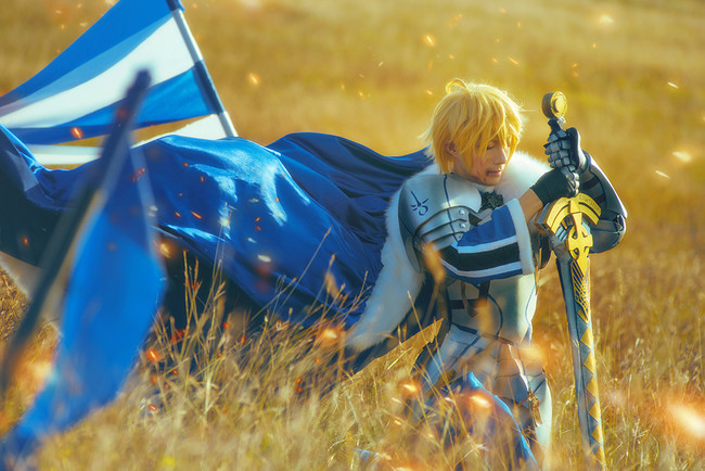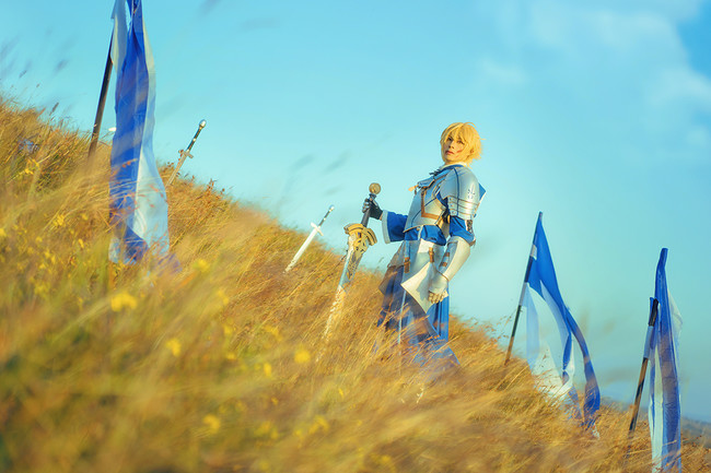 そんなアーサー・ペンドラゴンに挑戦したのは、受受SAMAさん。鎧に約束された勝利の剣(エクスカリバー)、さらに青と白の旗などを用意していて、さらに戦いをイメージして、広大な丘で撮影を行ったみたいです。美しい黄金色の丘のような、焼け野原のような雰囲気もまたGOOD…!