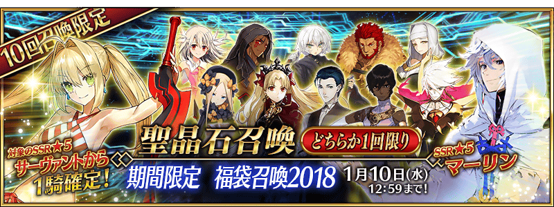 「福袋召喚2018」は、1月1日~1月10日12時59分の期間開催。★5(SSR)サーヴァント1騎確定の10回召喚になります。有償聖晶石30個が必要になるのでご注意を。