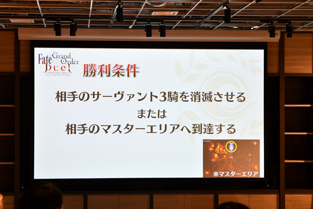 勝利条件は、場に登場している相手のサーヴァント3騎を消滅させるか、相手のマスターエリアへサーヴァントを到達させた場合。マップはシンプルなものでしたが、今後様々なマップがラインナップされるとのことです。