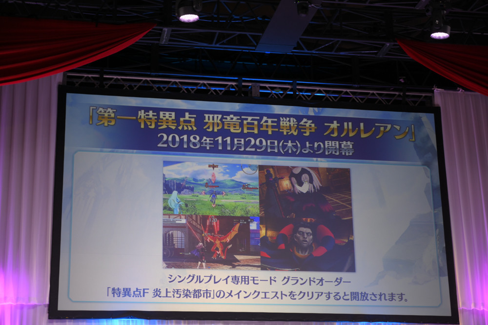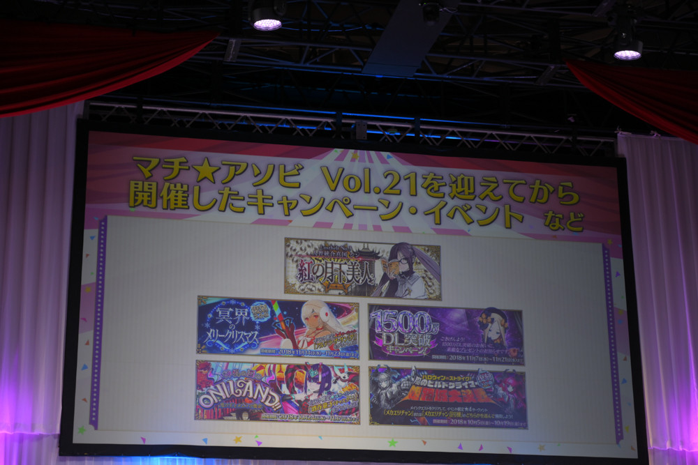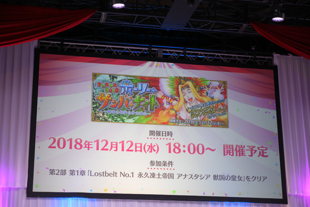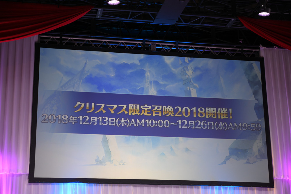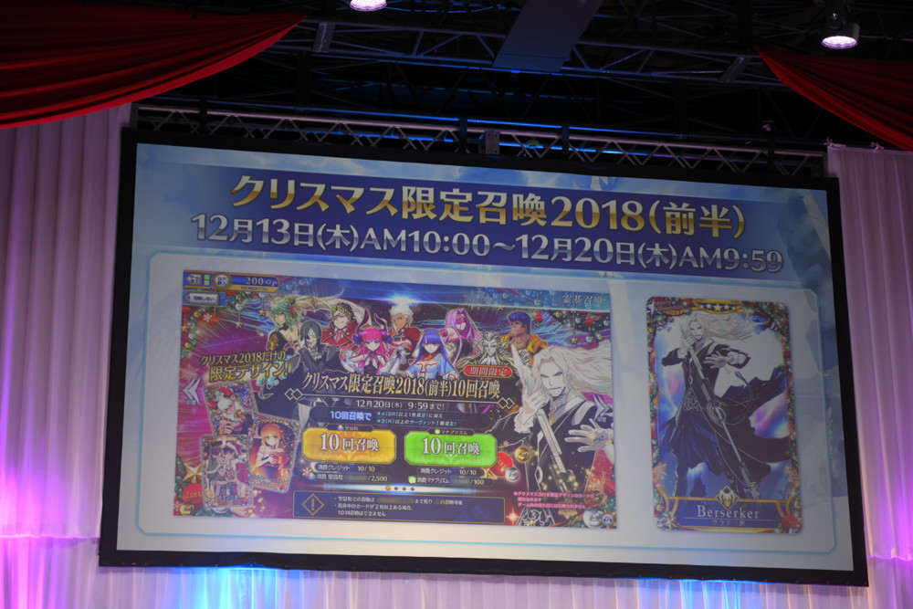 そして、FGO PROJECT関連情報を発表。FGOアーケードとしてのコラボカフェ開催や、FGO Duelの第5弾、さらに豪華作家が集結するFGOオーケストラに、FGO待望の冬のイベント「クリスマス2018 ホーリーサンバナイト」の開催、そしてケツァル・コアトル(サンバ/サンタ)の発表などが行われ、会場では大きな拍手が贈られました。その他、会場の様子は下の写真にて。