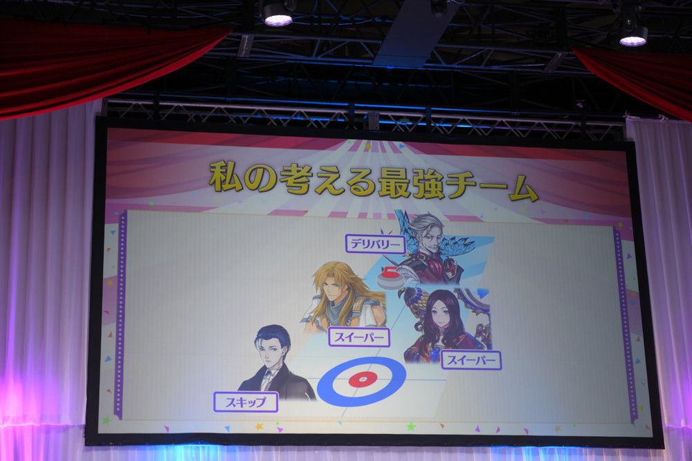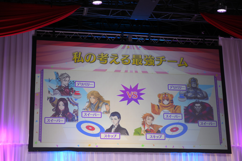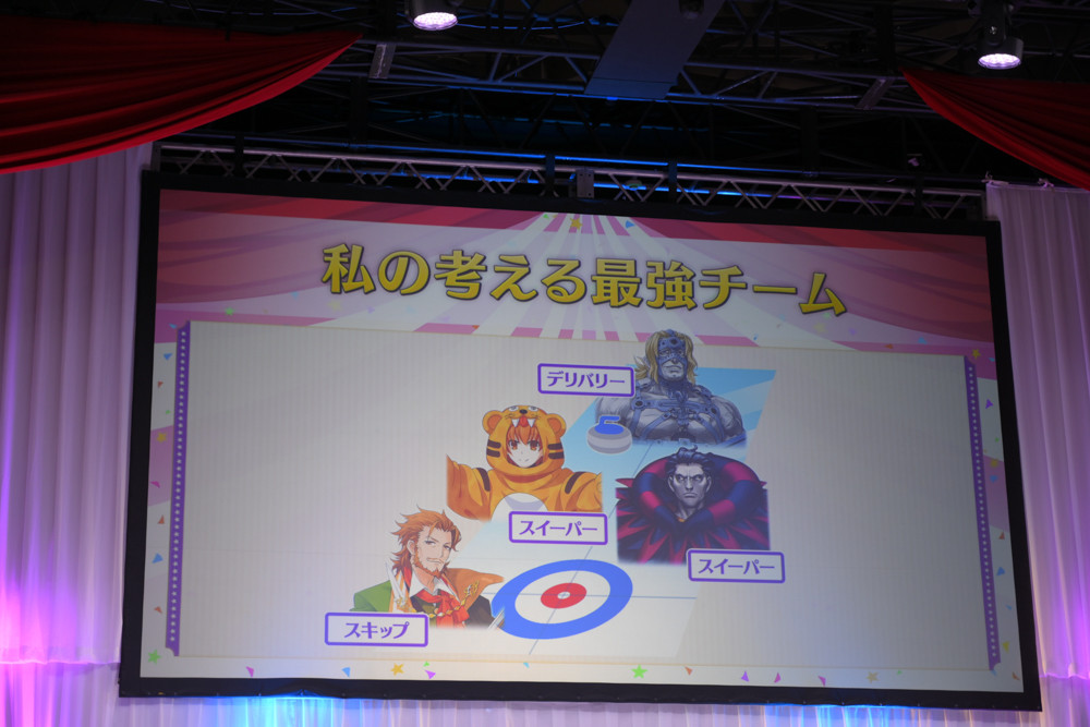 さらに、「私の考える最強チーム」を植田佳奈さんと鶴岡聡さんに考えてもらう企画も開催。北海道らしく「カーリング」を題材に、植田佳奈さんは知力に長けたサーヴァントを選び、鶴岡聡さんはパワー重視かつアニメ作品との関係性でサーヴァントを選んでいました。