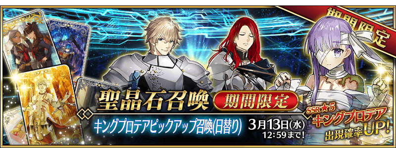 「キングプロテアピックアップ召喚(日替り)」では、「★5(SSR)キングプロテア」を常時ピックアップするほか、日替りで「★4(SR)ガウェイン」「★4(SR)トリスタン」を日替りでピックアップ。また期間限定概念礼装として「★5(SSR)我らが征くは星の大海」「★4(SR)月の海の生徒会」「★3(R)ザ・ケージ」