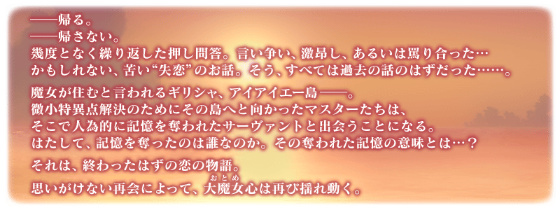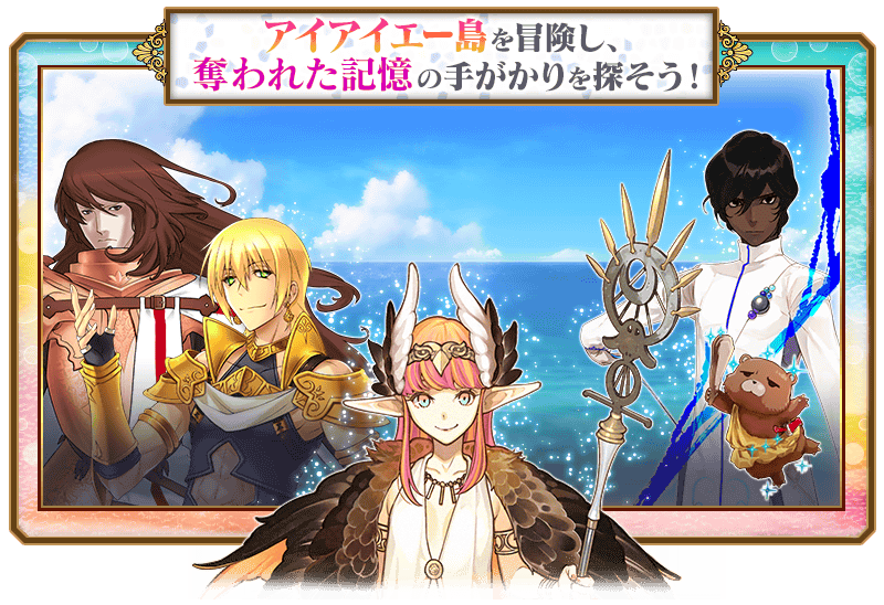 微小特異点が発生したギリシャ、アイアイエー島を舞台に繰り広げられる冒険。このイベントではすべての男性サーヴァントはイベントクエストにおける自身の攻撃の威力が50%アップのボーナスがあります。
