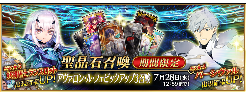 新サーヴァント「★5(SSR)妖精騎士ランスロット」と、「★4(SR)パーシヴァル」の登場する、アヴァロン・ル・フェピックアップ3召喚が開催されます。