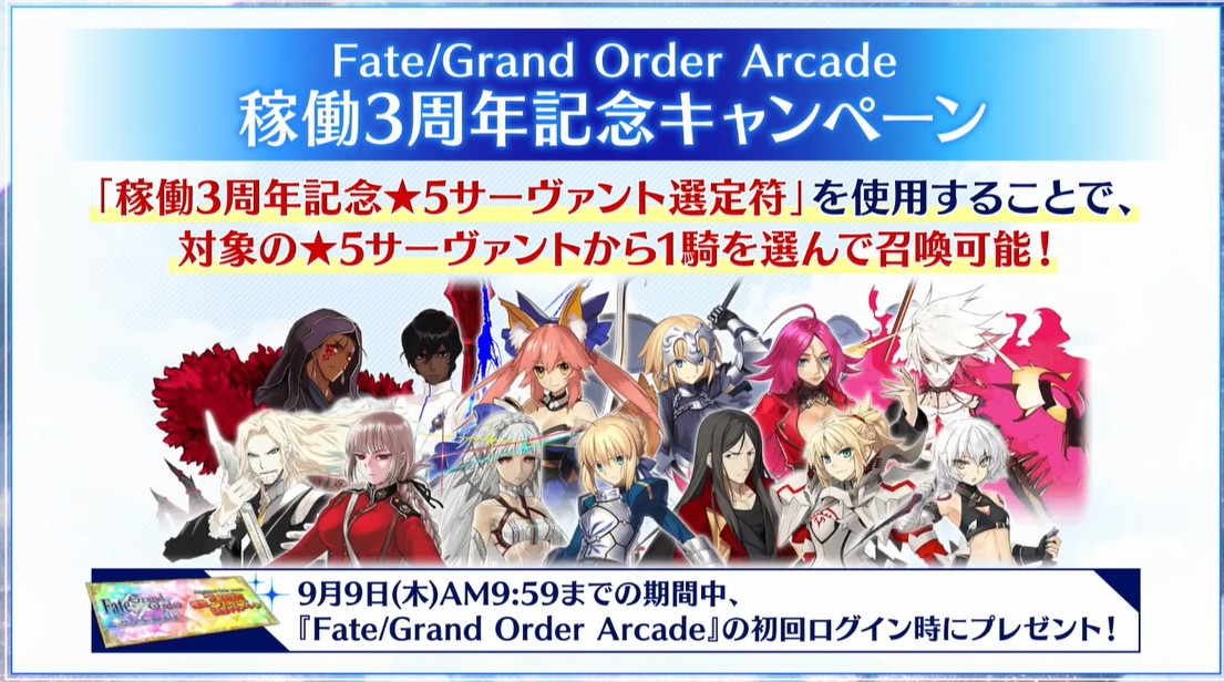 FGOアーケードの情報を発表。稼働3周年記念キャンペーン情報や、新情報として水着サーヴァント・ランサー虞美人とランサー・玉藻の前が実装。8月2日より2騎のサーヴァントが登場するイベントが実装されます。