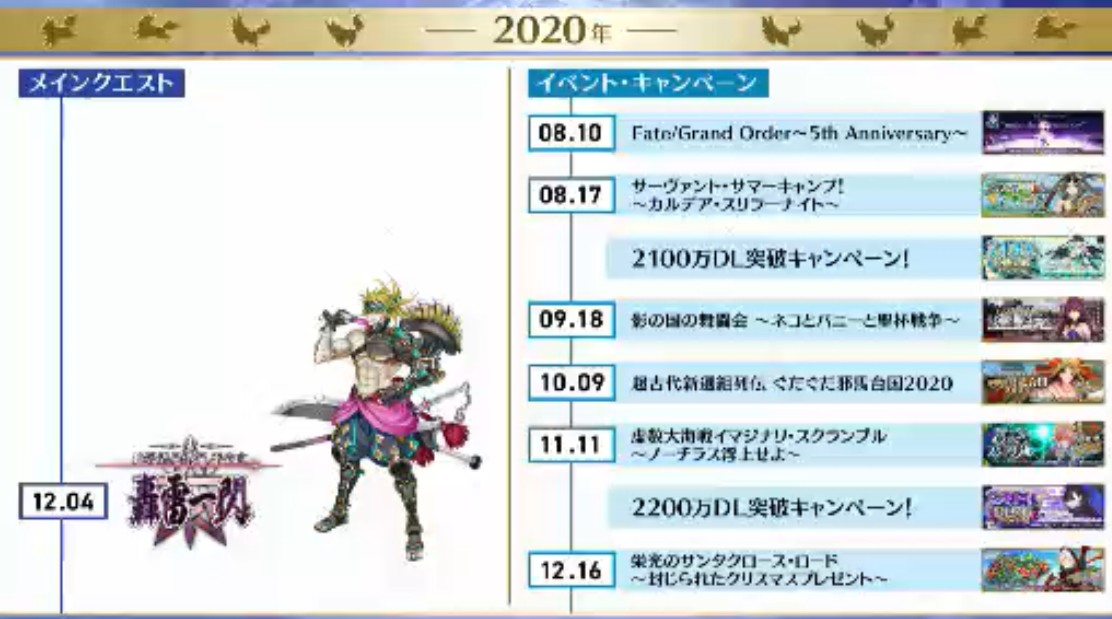 今年も10大キャンペーンを実施。6周年記念特別連続ログインボーナス&聖杯獲得できる特別回数ログインボーナス、種火集め&修練場の消費AP1/2とクエスト全開放に大成功・極大成功率3倍、種火集め&宝物庫の扉を開けに極級追加、クエスト戦利品で種火レアリティやQP獲得量アップ、アイテムの所持枠と保管枠追加&QP上限が約2倍の20億にまで拡大。