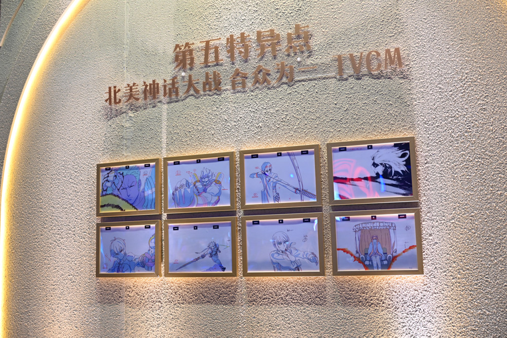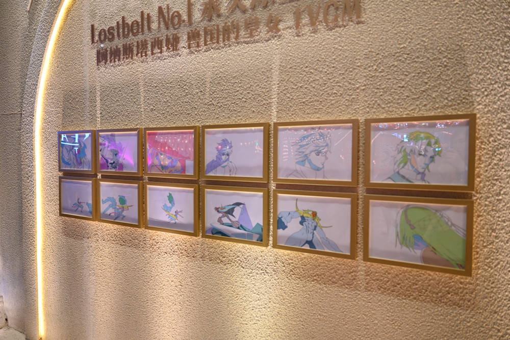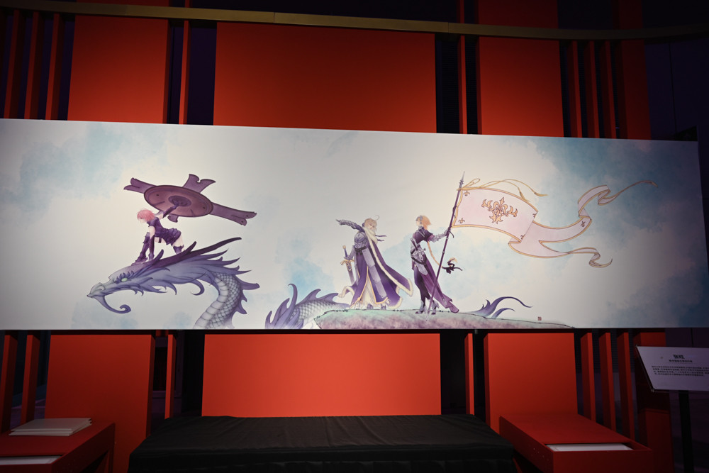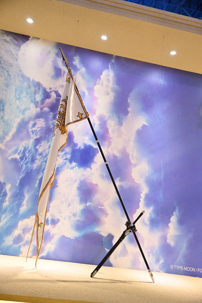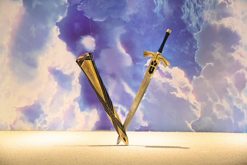 FateシリーズからFGOまでの歴史を振り返るコーナーでは、FGOのアニメCMの原画などを展示。さらには中国で過去に作られたエクスカリバー、マシュの盾、ジャンヌ・ダルクの旗があり、これらは中国の職人によって作られたものになります。エクスカリバーは本物の刃物なので触るの厳禁です。