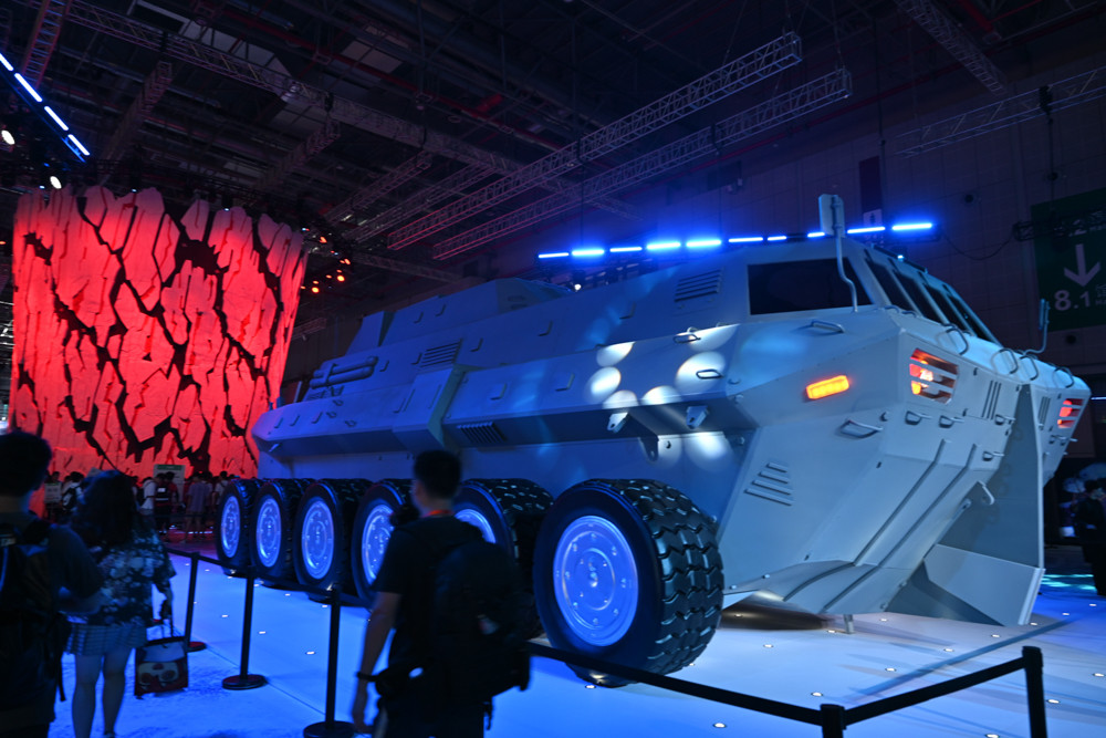 会場に入るとすぐに目に入ってくるのが、巨大なシャドウ・ボーダー。これは日本でも展示がされていないサイズです。高さ12メートル、幅は10メートルを超えていて、とにかく迫力満点。タイヤのサイズだけで人間と同じ高さ!